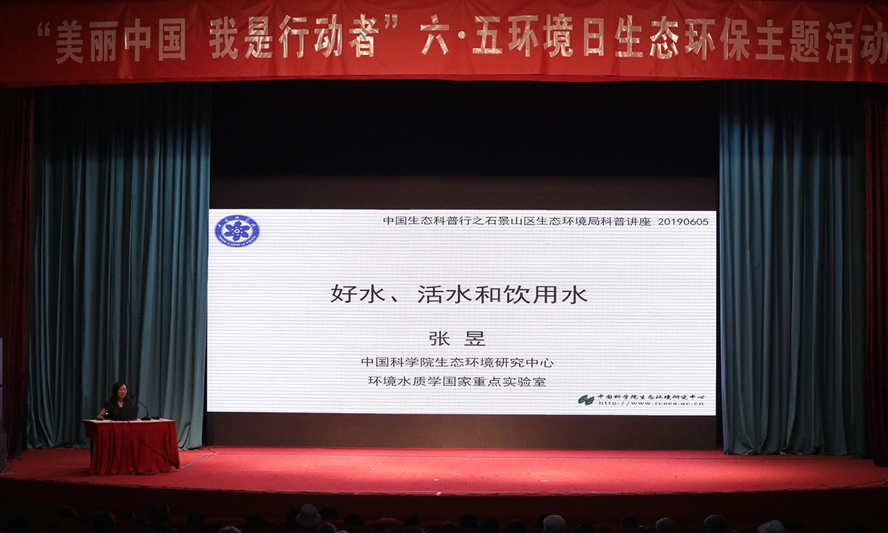 发布时间:2019-06-06 点击量:02019年6月5日第48个世界环境日,受北京石景山区生态环境局的邀请,微生物生态专业委员会主任委员、中科院生态环境研究中心张昱研究员为石景山区生态环境局主办的“美丽中国,我是行动者” 2019年六·五环境日主题宣传活动进行环保科普讲座。此次科普讲座也是科普工作委员会组织的中国生态科普行的系列活动之一。张昱研究员用生动的案例,浅显易懂的语言为大家带来了关于“好水、活水和饮用水”的科普讲座,这一场与民生息息相关的水环境科普讲座,让观众了解到什么是好水、活水、水污染及控制原理、日常饮用水的由来及选择方式等丰富的水和生态相关科普内容