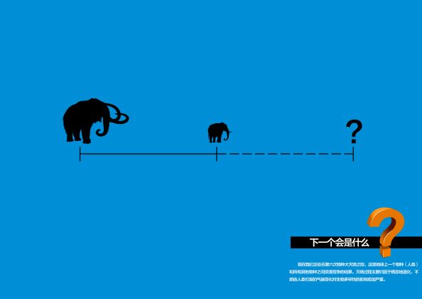 发布时间:2021-05-19 点击量:884本设计以从前远古生物到现在生物的一个过渡再到后面一个大大的问号,表示物种灭绝和生态系统退化迅速并不断加快。地球物种消失速度比自然灭绝的速度要快100到1000倍。 哥本哈根大学卡斯滕教授说,地球史上物种大规模的灭绝发生过五次,最近一次是发生在6500万年前的恐龙和其他许多物种的灭绝。现在我们正处在第六次物种大灭绝之际,这是地球上一个物种(人类)和所有其他物种之间资源竞争的结果。灭绝过程主要归因于栖息地退化,不断由人类引发的气候变化对生物多样性的影响愈加严重。 下一个会是什么?给我们人类一个问号,更是一个警示!