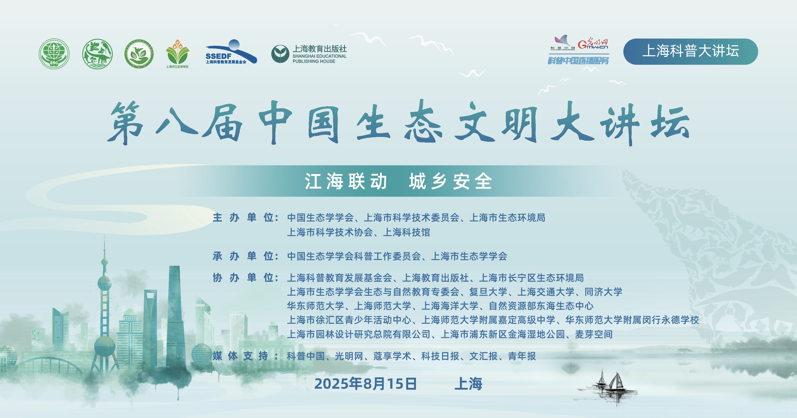 发布时间:2025-08-16 点击量:74722025年8月15日是第三个全国生态日,今年全国生态日的主题为“绿水青山就是金山银山”。当天上午,由中国生态学学会、上海市科学技术委员会、上海市生态环境局、上海市科学技术协会、上??萍脊萘现靼欤泄аЩ峥破展ぷ魑被?、上海市生态学学会承办,上??破战逃⒄够鸹?、上海教育出版社、上海市长宁区生态环境局、上海师范大学等十余家单位协办的第八届中国生态文明大讲坛在上海成功举办。本次活动以“江海联动 城乡安全”为主题,特邀院士在内的专家团队,积极开展生态文明宣传教育活动,共同探讨生态文明建设前沿议题,向全球展示中国超大城市生态文明建设成果。
